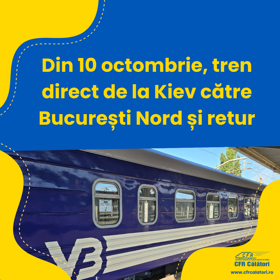 - Trenul internațional IR 99/401: Kiev (plecare 06:30) – București Nord (sosire 06:47), circulă începând cu data de 10/11.10.2025;
